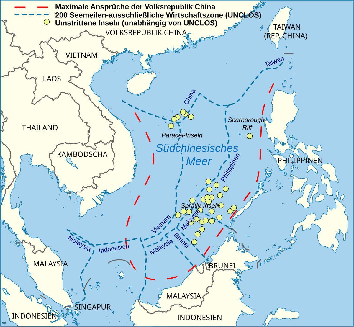 Taiwan pun mengajukan klaim serupa dengan China berdasarkan alasan historis. Sementara Indonesia secara resmi tidak mengklaim pulau-pulau besar di sana, wilayah perairan di sekitar Natuna Utara kerap bersinggungan dengan klaim China.