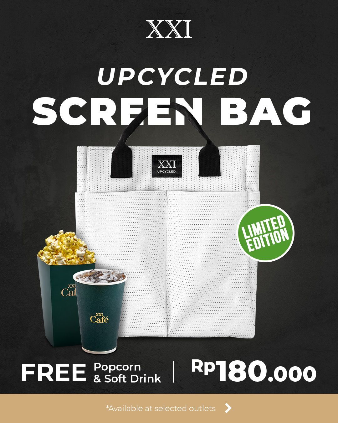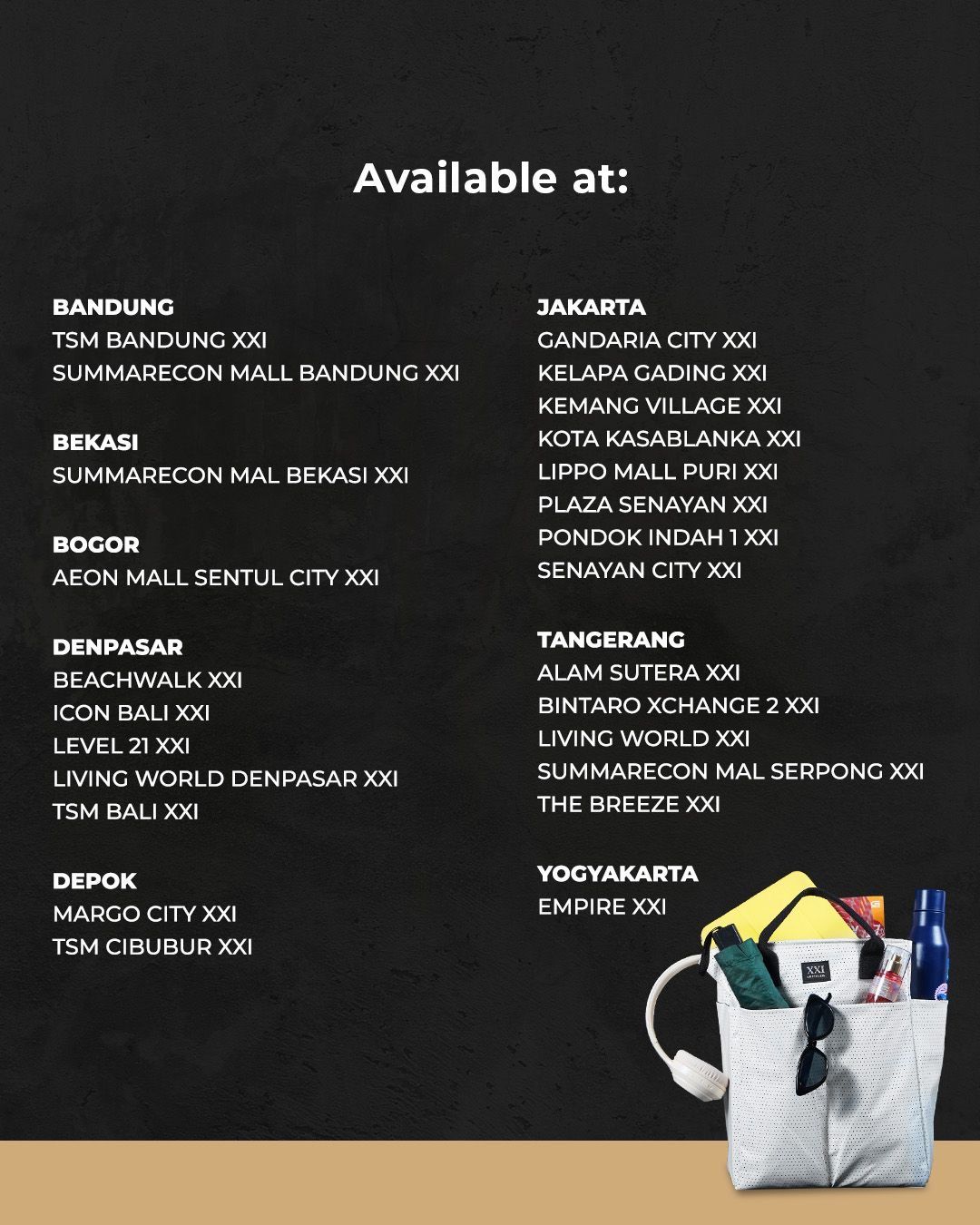 XXI Screen Bag edisi terbatas ini tersedia di sejumlah bioskop pilihan Cinema XXI di area Jabodetabek, Bandung, Yogyakarta, dan Bali dengan harga Rp180.000. Setiap pembelian tas akan mendapatkan free salt popcorn dan soft drink.